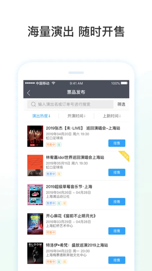 [演出管理]实时在线管理演出列表,对有票项目一键挂售;