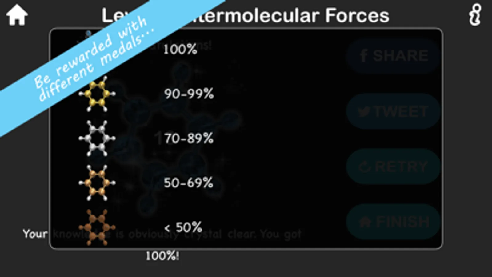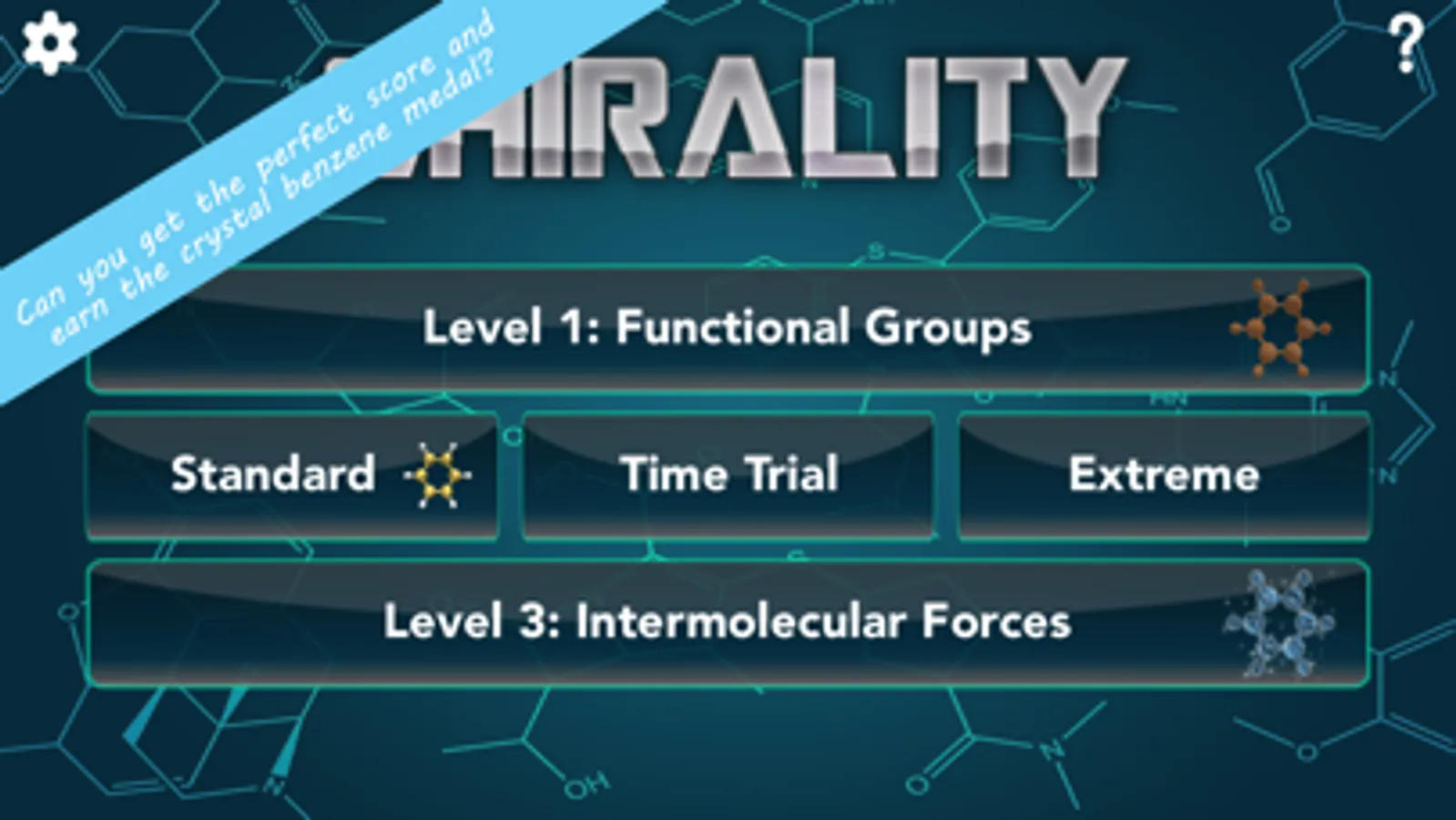 Chirality also lets you compete with your classmates on social media. As you progress you’ll earn medals; the higher your score, the better the medal. Get a high score; Why not post it to Facebook, and/or tweet to your friends? Can you get the elusive blue-diamond benzene medal for the perfect score?