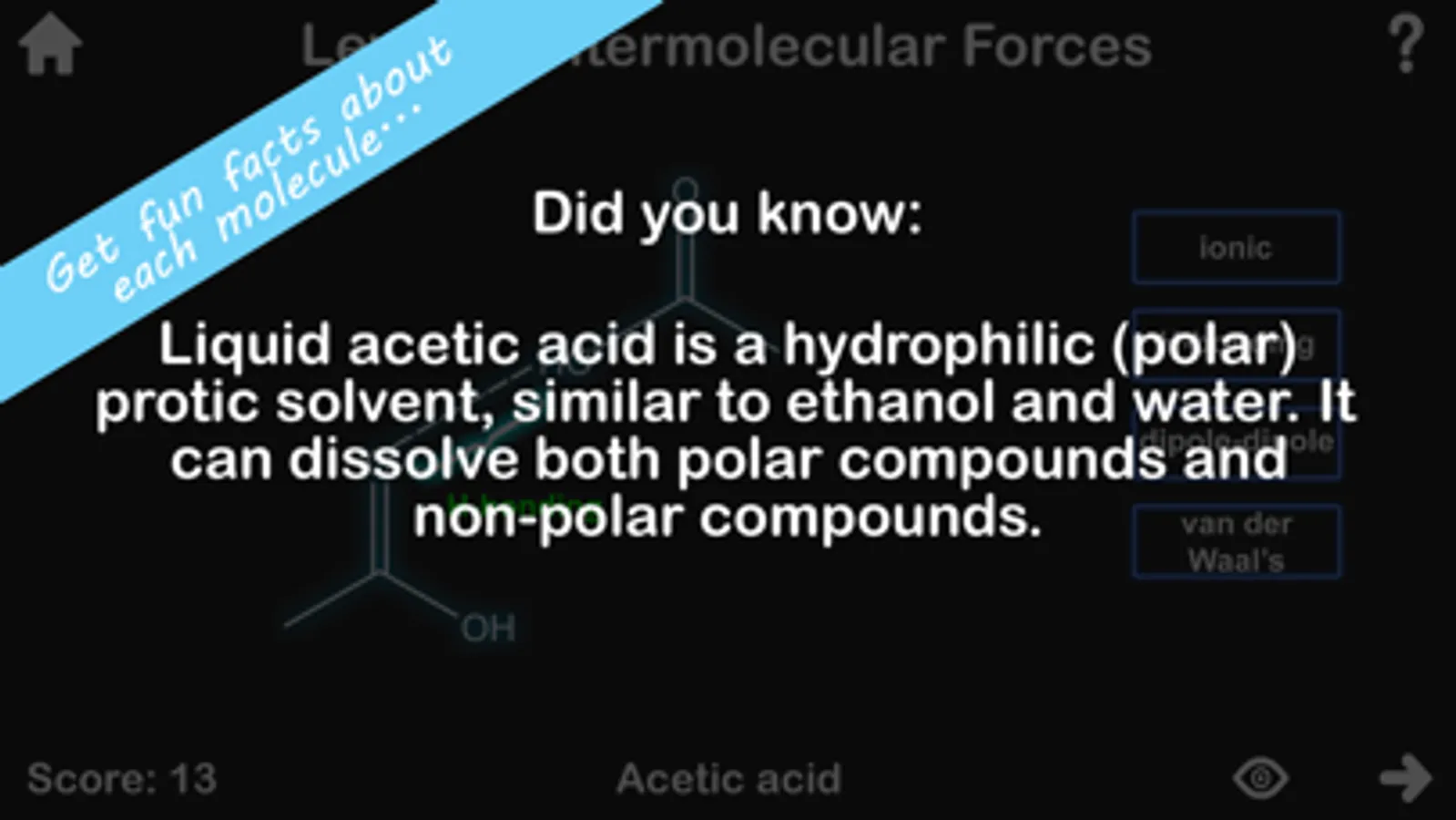 Topics covered include functional groups, structure classification, and intermolecular forces and when you finish a question you will get a fun fact about the structure you were looking at.