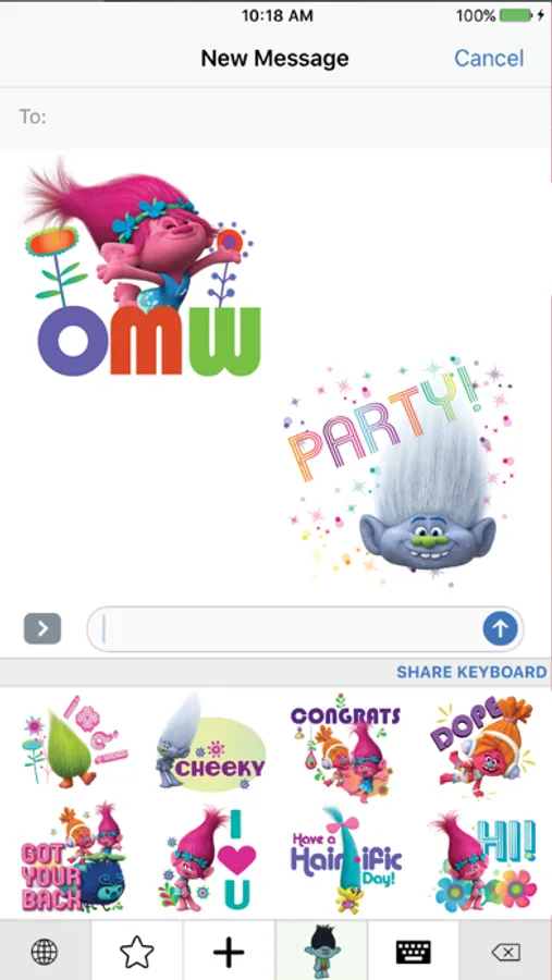 Now you can add some sparkle and shine to your messages with stickers of your favorite characters from DreamWorks Animation’s TROLLS! Join Poppy, Branch, DJ Suki, Guy Diamond, Biggie, Cooper and more to show your true colors with messaging stickers and photos stamps from the heart!