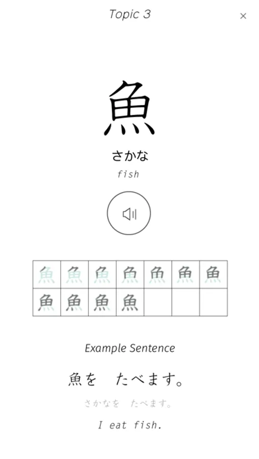 -Features pictures, sound, animation, kanji, stroke order and example sentence to help you remember the kanji.
