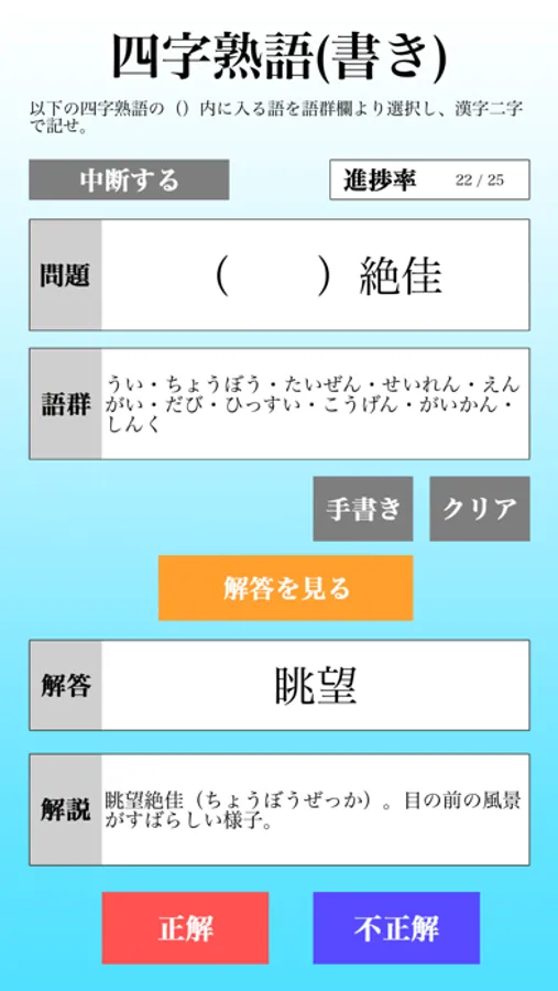 本アプリではほぼ全ての問題に解説が入っているため、意味のわからない熟語がでてきてもその都度辞書を引く必要がありません。