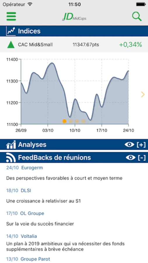 - Une vue agrégée de nos dernières publications (news, feedbacks, analyses) et de l’évolution des principaux indices français et de la volatilité