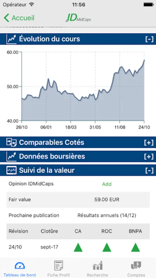 - Un tableau de bord qui reprend de manière synthétique les données boursières (évolution du cours, volume, capitalisation, beta calculé, etc.), notre suivi de la valeur (opinion, fair value, date de prochaine publication, dernière révision des prévision), l’actionnariat de la société, ses comparables cotés et une vue graphique des performances économiques de la société sur longue période