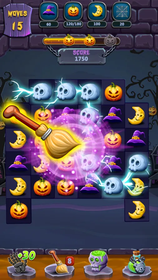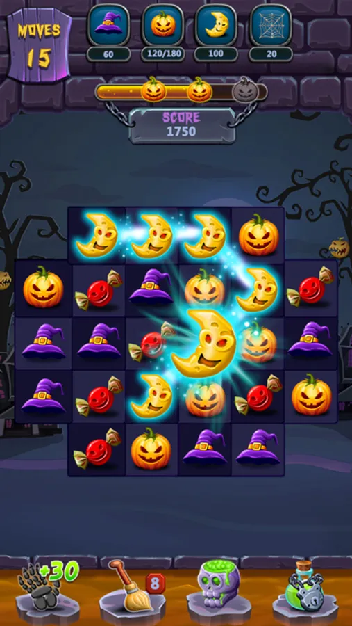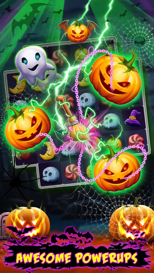 Play strategically with lesser moves and time to collect more number of magical pumpkins and unlock the mystic powers like gas pot, magic skull, power broom, and monster hand to complete the challenging levels. Spin Wheel and lucky to get the powers and candies to use in the game play.
