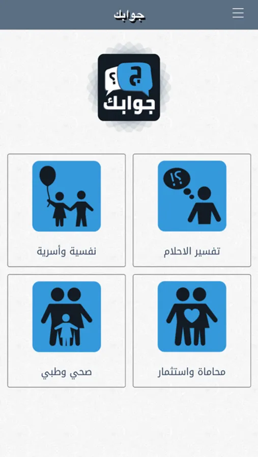 تطبيق (جوابك) هو أول تطبيق احترافي تفاعلي مختص بتقديم الاستشارات والإجابة على جميع استفسارات العملاء في العديد من المحاور الهامة مثل: تفسير الأحلام ، الاستشارات النفسية ، والأسرية ، الاستشارات القانونية والمحاماة ، الاستشارات الاستثمارية ، بالإضافة إلى الاستشارات الطبية والصحية والتغذية السليمة . وذلك للجنسين ولجميع الأعمار . حيث يقوم على التطبيق نخبة من الاستشاريين الاحترافيين كل في مجاله وتخصصه .