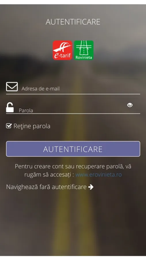 Pentru a putea achita rovinieta și peajul prin intermediul aplicatiei eTarife trebuie să va creati un cont de utilizator pe portalul www.erovinieta.ro, deținut de CNAIR - SA
