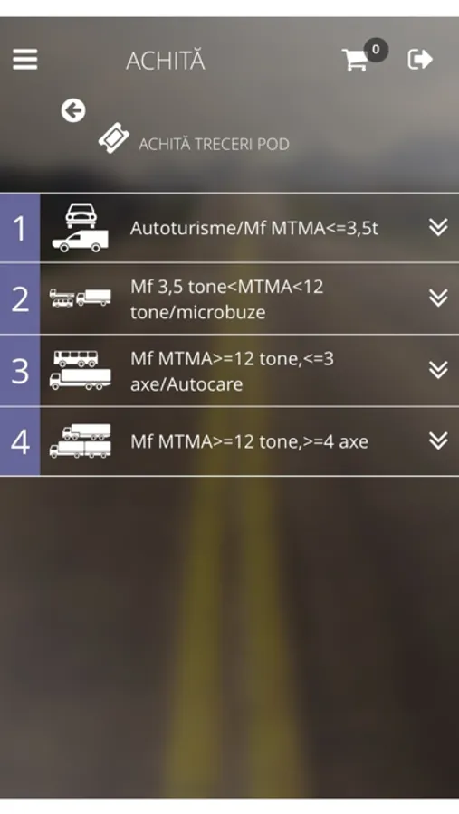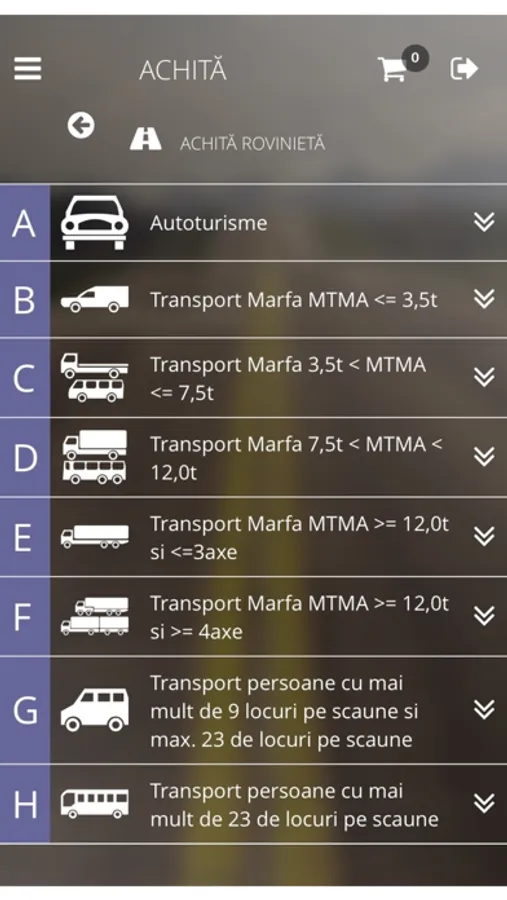 - consultarea listei de tarife pentru rovinietă și peaj pentru toate categoriile de vehicule