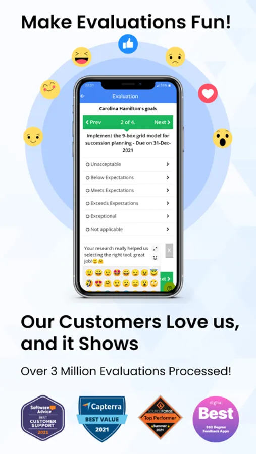 Our flexible evaluation program accommodates everything from continuous feedback, scheduled appraisals, project-based evaluations, 360-degree evaluations, and client satisfaction evaluations all within a single account.