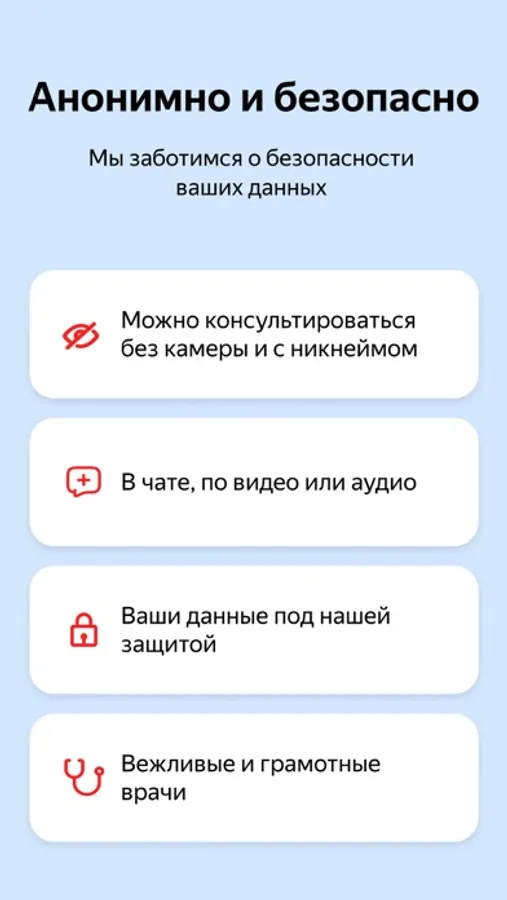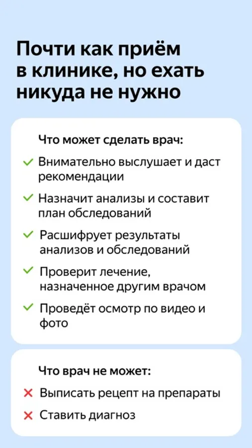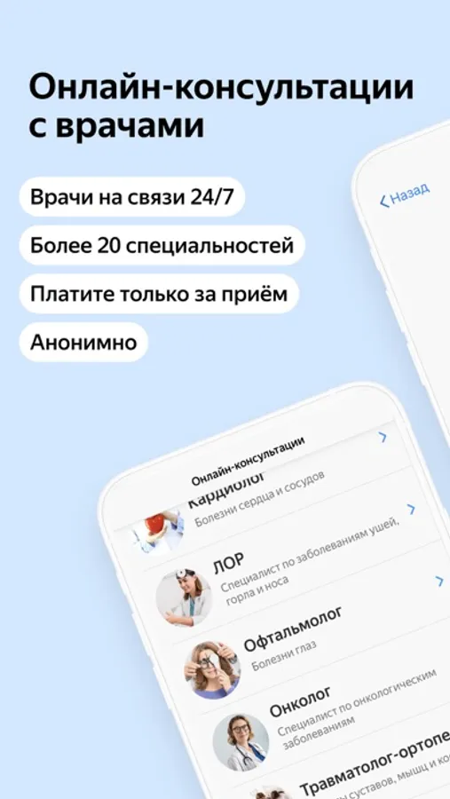 Yandex.Health is a mobile application that lets you get quick answers to your health-related questions wherever you are – in your own bedroom, out of town or on a business trip away from home. Consult with qualified doctors of various specialties, including GPs, pediatricians, gastroenterologists, gynecologists, dermatologists, urologists, allergist-immunologists, neurologists, venereologists, psychologists, cosmetologists and veterinarians, without making an appointment or waiting for your turn in a clinic – your request gets a response within minutes.