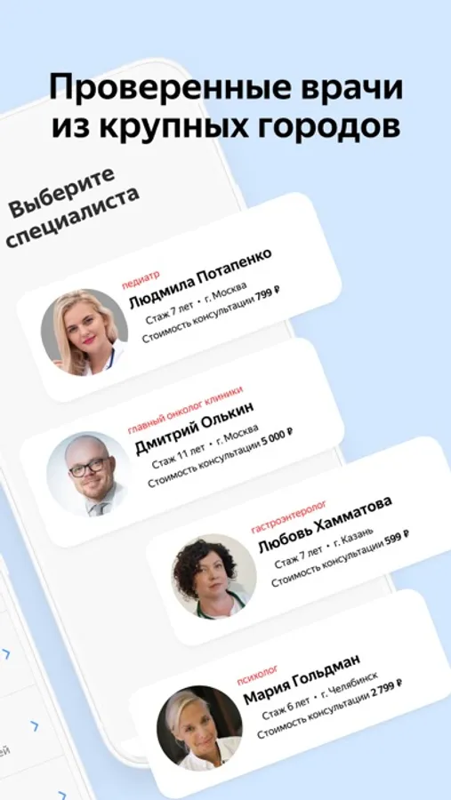 All Yandex.Health doctors have on average nine years of practicing experience. They consult from Moscow and other locations in Russia and have been vetted though tests and interviews and specially trained before joining the service.