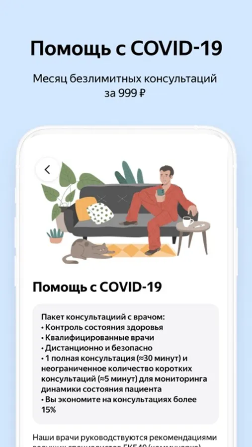 Yandex.Health is available to Russian-speaking users worldwide. Customers can pay 499RUB for a single 30-minute consultation with any specialist – for getting a detailed explanation of their symptoms; or use a 5-minute consultation for getting a quick answer to their question or to have their test results explained by a general practitioner, pediatrician, gynecologist or a vet – for 99RUB.