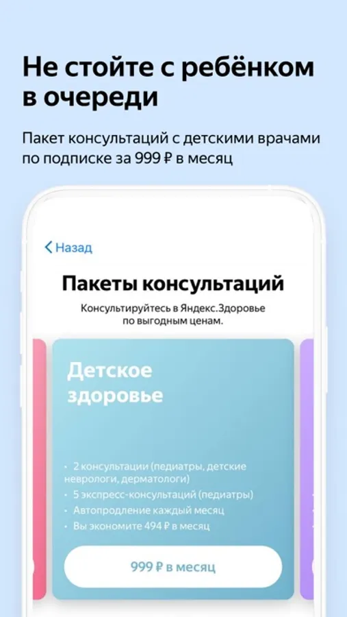 • Use Yandex.Health for a single consultation with one specialist from time to time, or save on charges by buying a subscription.