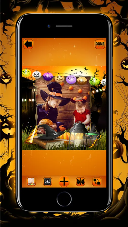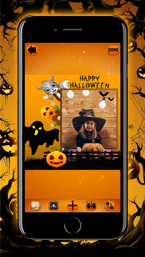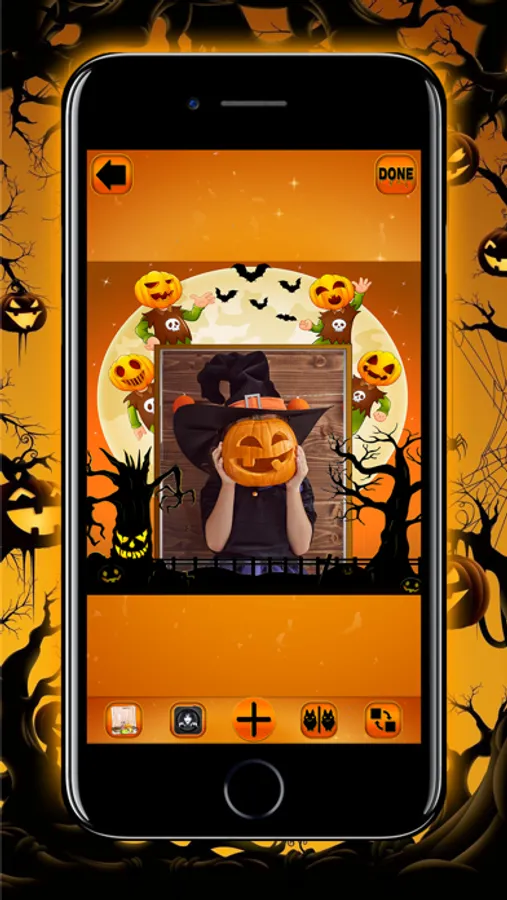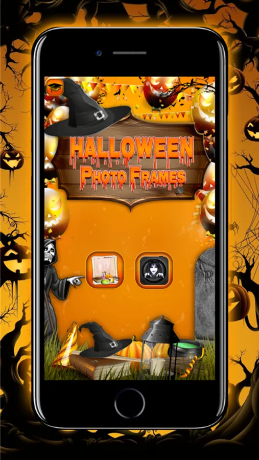 Select a Halloween picture from the gallery of your phone and use this image editor to decorate it! Take a new photo with your camera and apply a cool photo frame. Rotate, scale, zoom in, zoom out or drag the photo to fit the frame as you like. Choose from twenty happy Halloween picture frames inspired by carved pumpkins and horror movies, and try them all out. Save your new picture and share it instantly on social networks.