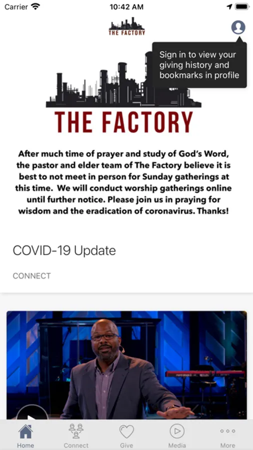 We invite you to connect with us and stay informed through The Factory Church's app. Download the app to hear messages, stay informed, and help us make disciples the other six days.