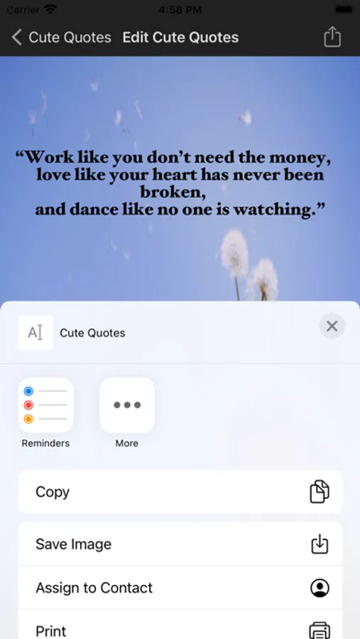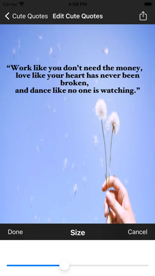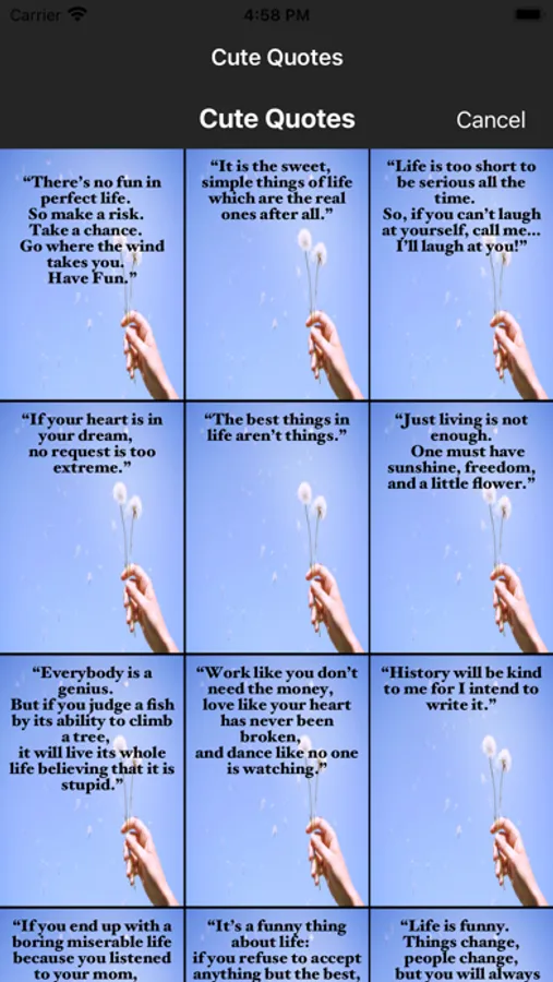 This cute quotes app allows choosing various quotes, background images and allowing them share in social media or sending them through email.