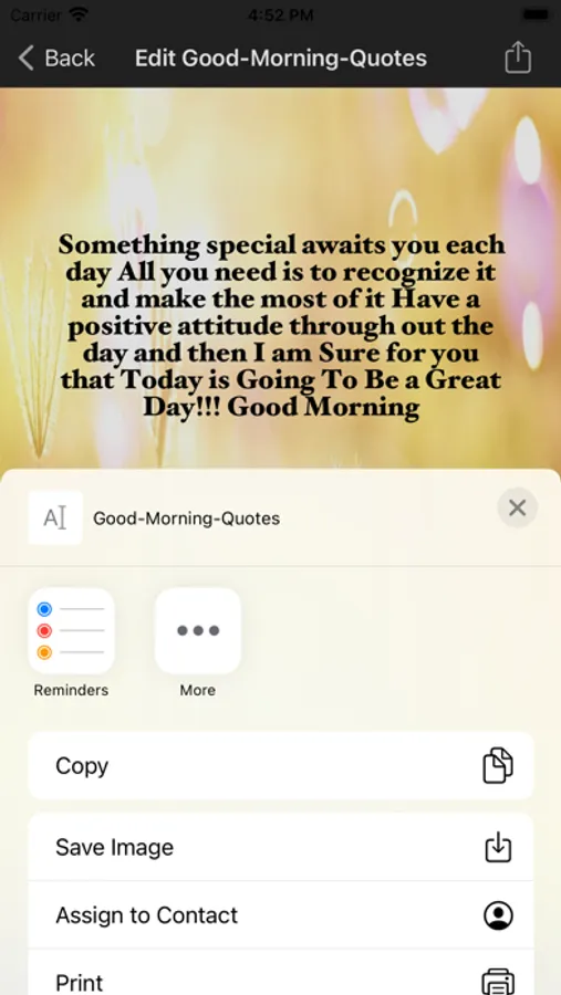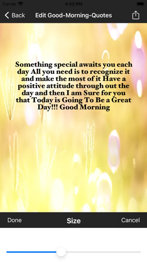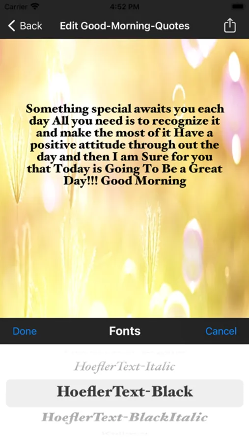 This good morning quotes app allows choosing various quotes, background images and allowing them share in social media or sending them through email.