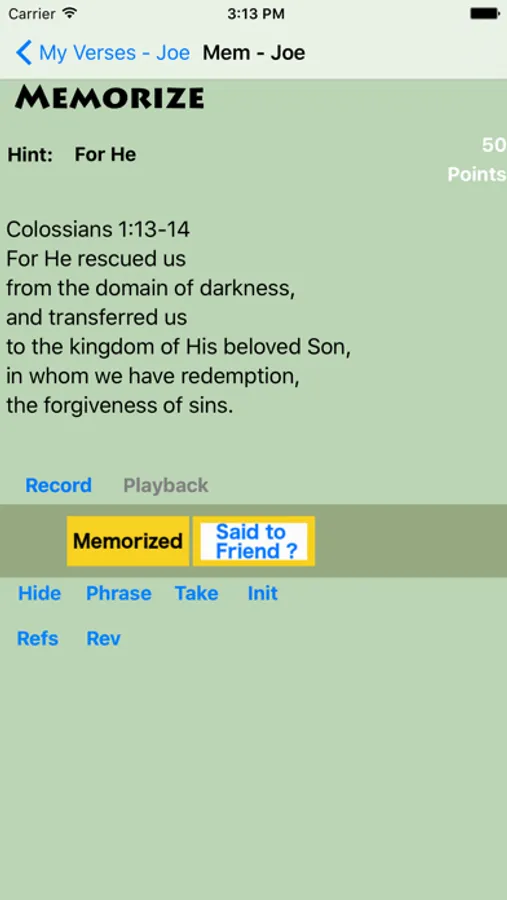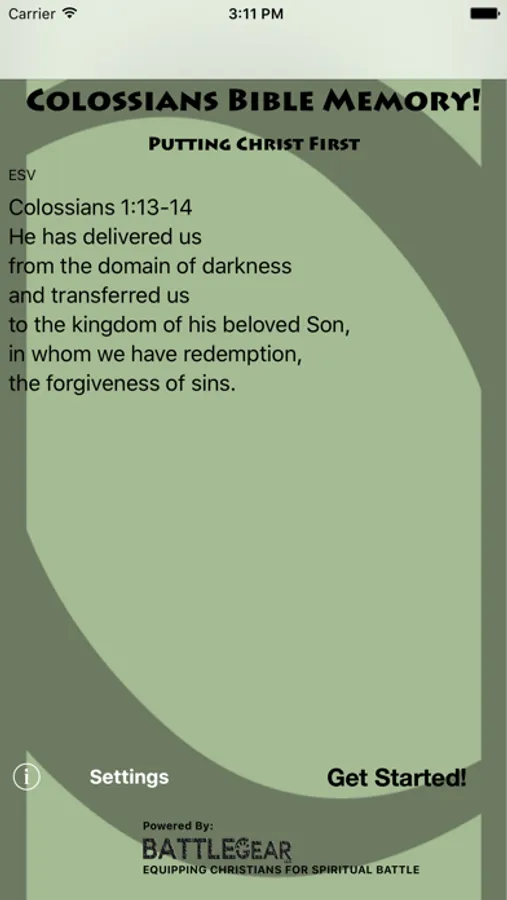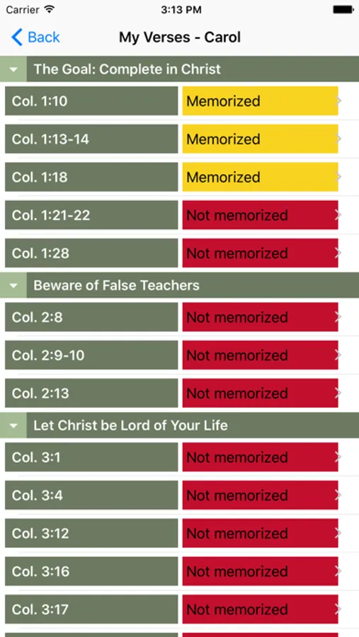 Here’s help for memorizing key verses in the book of Colossians. See, say and record the verses, and play several games to help you commit verses to memory. Tracks memory and review status for multiple participants and gives points for their memory/review activity. Shares memory status information across multiple devices via iCloud.