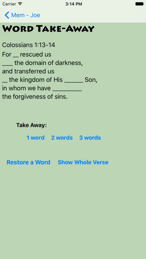 - Memory games such as Phrases (show a phrase at a time), Word Take-Away, and Reference ID (gives the Scripture text and lets you choose the reference)