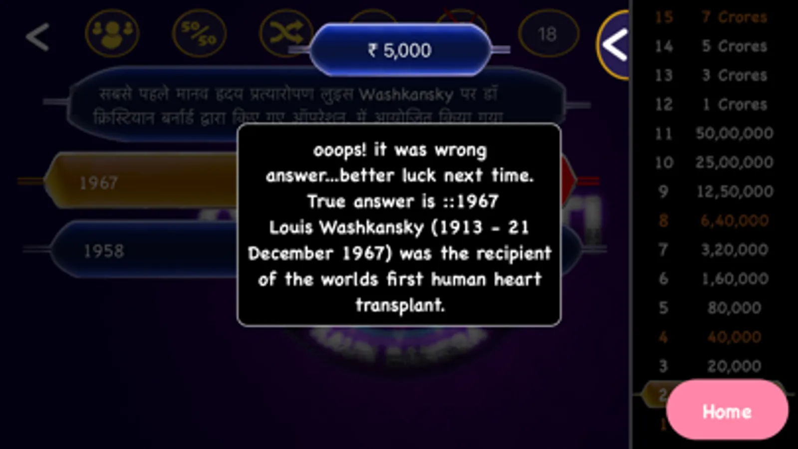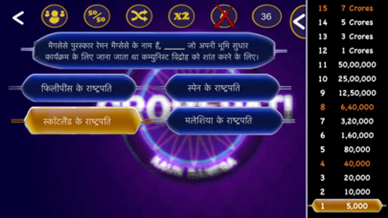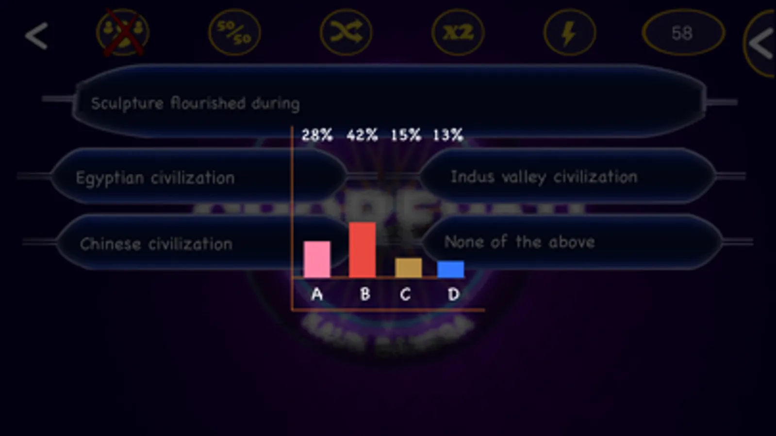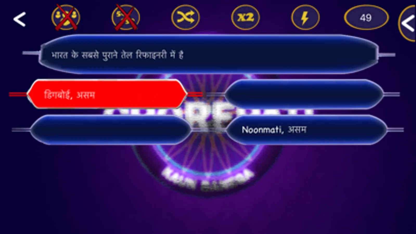 3. 50-50 : In this help line, player can get rid of 2 wrong options.