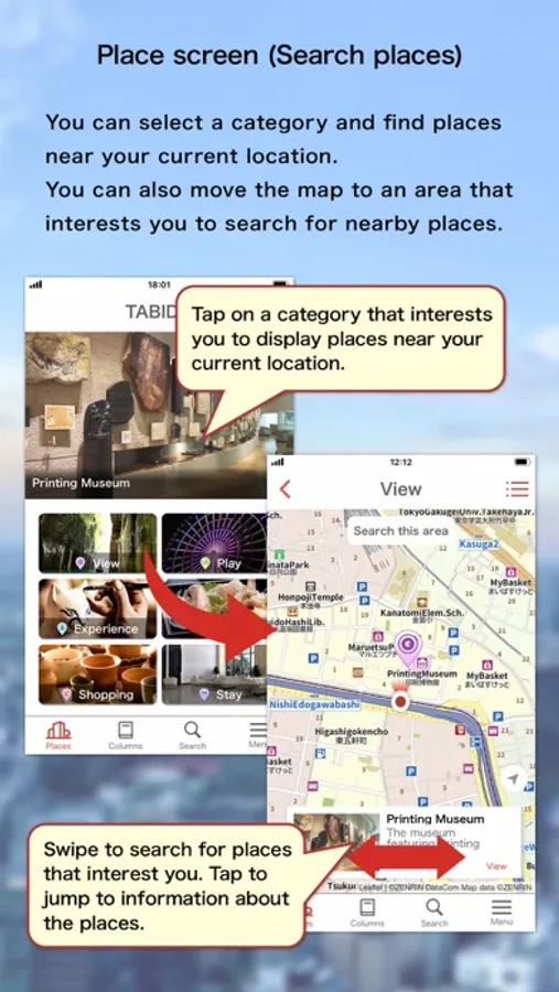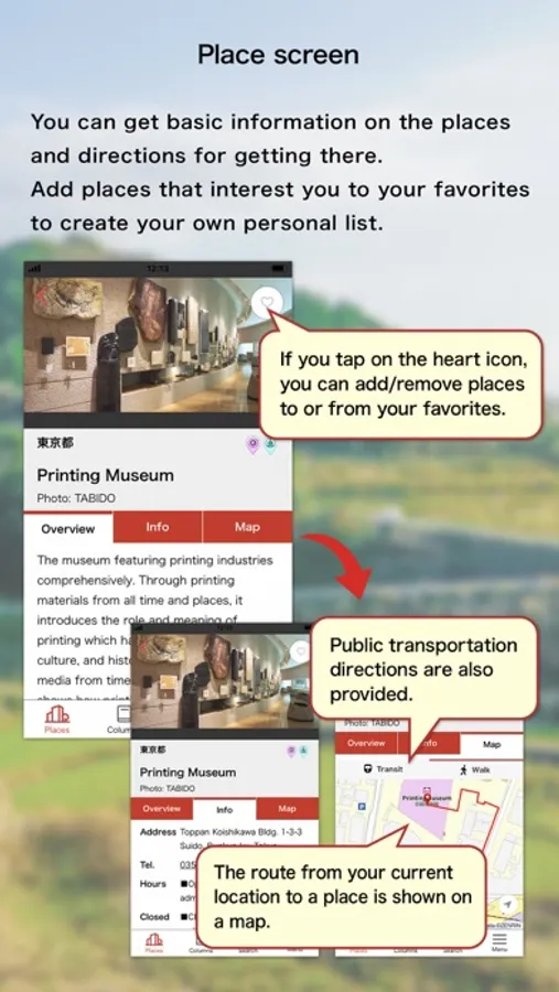 - After choosing Maps from tourist spot information, all you then need to do is choose how you’ll get there. TABIDO guides you to your destination via the ideal route!