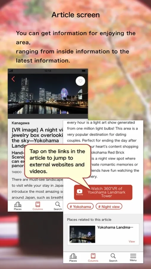 The TABIDO app brings you the scenery of tourist hotspots, which vary by season and time of day, in 360° VR.