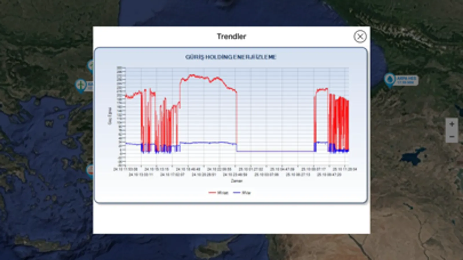 Güriş Holding bünyesi altındaki enerji üretim tesisleriyle ilgili anlık verilerin aktarıldığı uygulama. Uygulama içerisinde günlük trendleri de görmek mümkün.