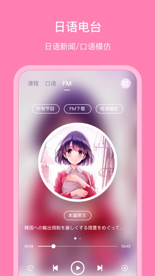 除日语配音功能外,我们还为用户提供了系统的日语学习课程,从零基础五十音图发音、日语初级中级课程、实用日语口语、高考日语、旅游日语、手机教日文打字等课程均有开设,并且我们还提供日语生活口语练习、日本电台节目、日语兴趣群组等实用学习功能,全方位提升你的日语水平!