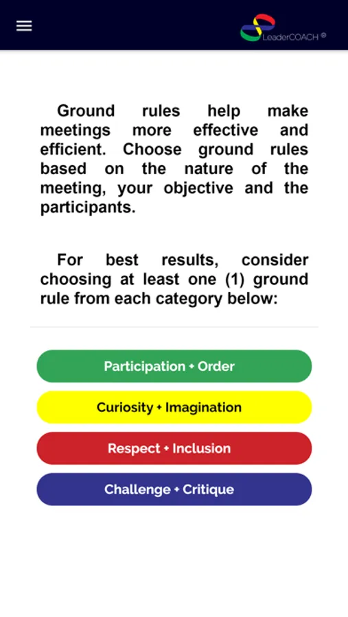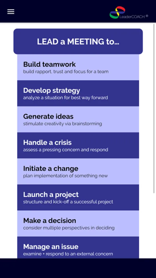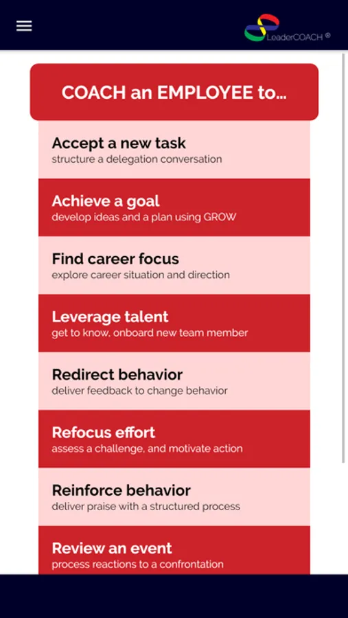 The base app introduces you to the complete functionality of LeaderCOACH™ using a common conversation type: