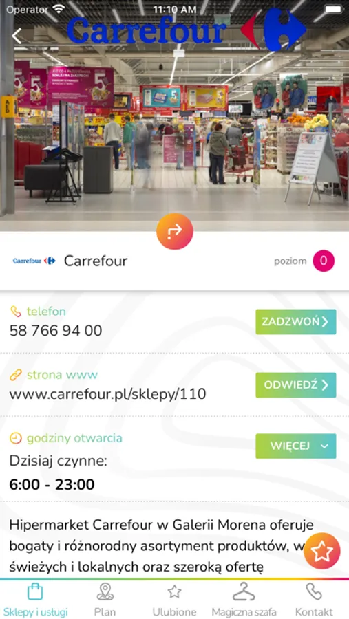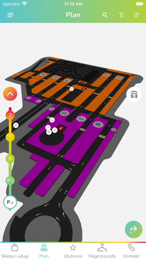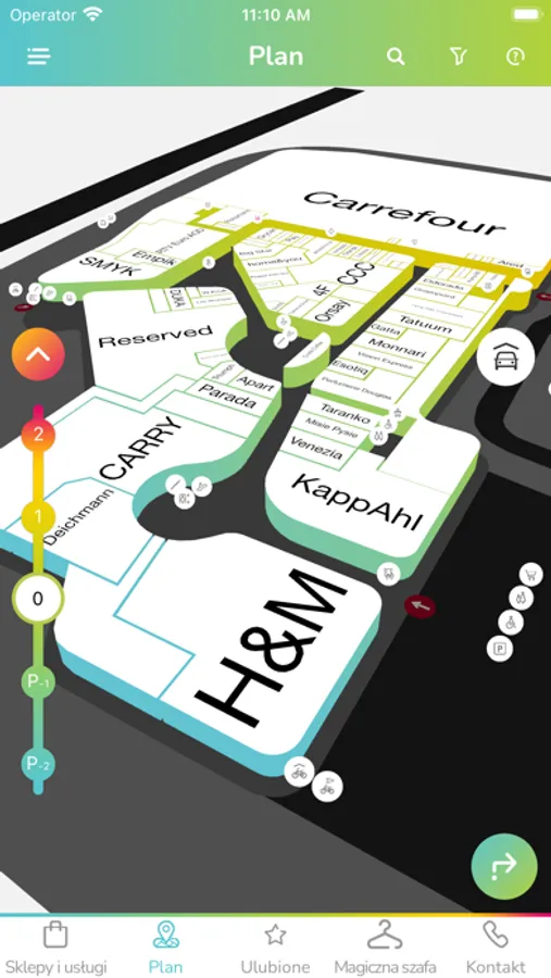 Aplikacja zawiera pełną listę sklepów i lokali usługowych, wraz z danymi na temat każdego z miejsc, takimi jak godziny otwarcia, numer telefonu, strona internetowa, a także menu restauracji czy plan fitness klubu. Zoptymalizowany zestaw filtrów pozwala na łatwe wyszukanie interesującego nas miejsca. Trójwymiarowa mapa wraz z możliwością wyznaczenia trasy między dwoma punktami ułatwia dotarcie do konkretnego sklepu oraz automatycznie doprowadzi do najbliższej windy, toalety lub wyjścia, przewidując też specjalną trasę dla osoby niepełnosprawnej.