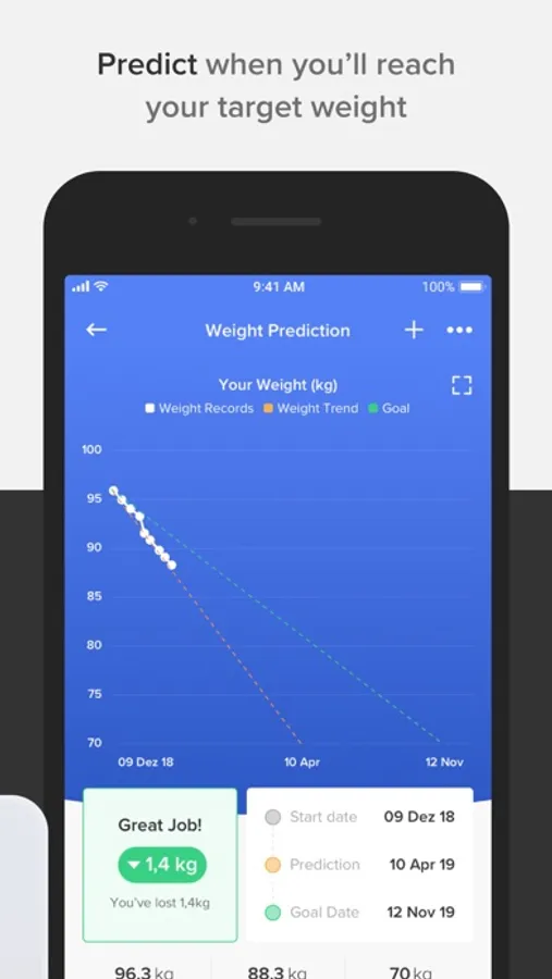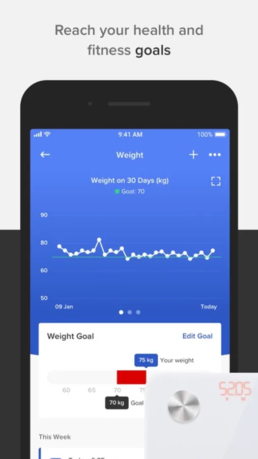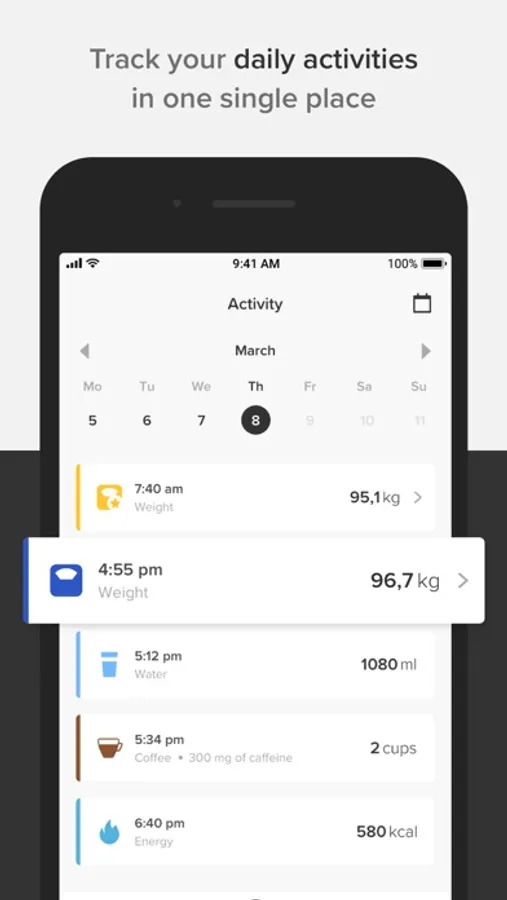 Track your body weight, muscle mass, body fat percentage, bone mineral mass, body water, visceral fat, body mass index (BMI) and basal metabolic rate (BMR).