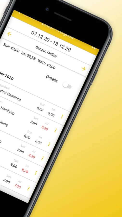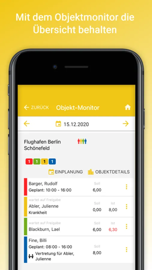 Über die App können Ist- und Sollzeiten verglichen werden oder manuell nachgetragen werden. Über den Mitarbeiter-Monitor ist zu jedem Zeitpunkt sichtbar, wo Zeiten fehlen.