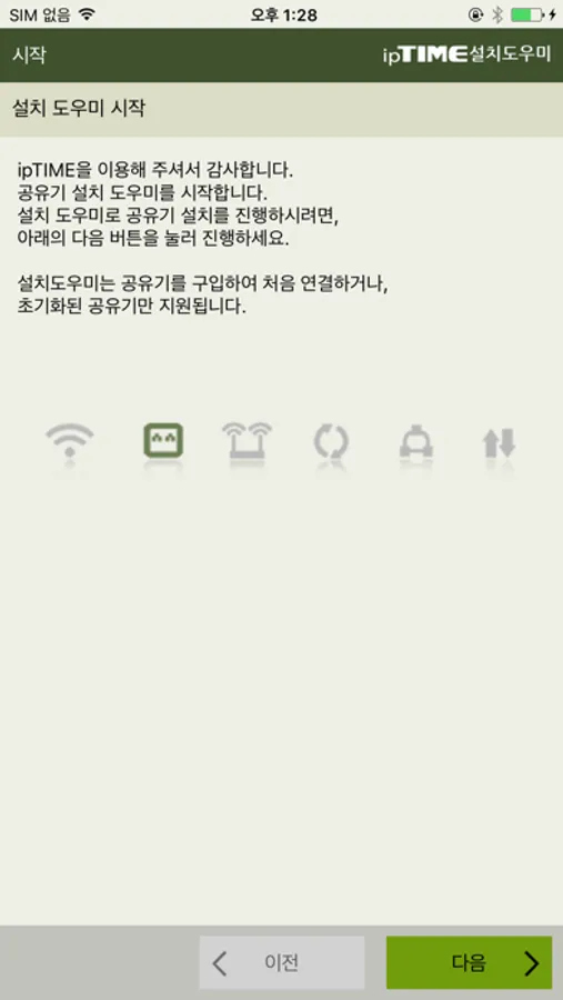 이 앱은 새로 구입하여 연결하는 ipTIME 공유기 또는 초기화 된 ipTIME 공유기(공유기 펌웨어 버전 9.96,8 이상)에서 동작합니다.