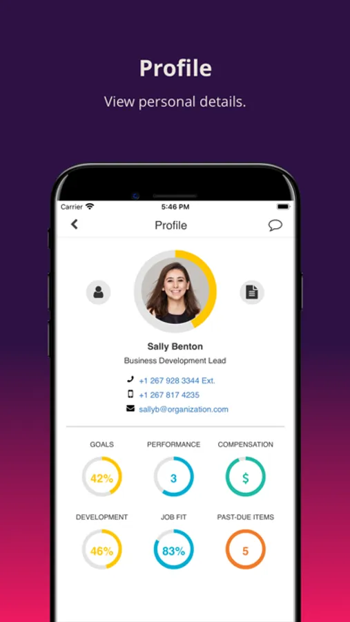 · View Complete employee profile, including metrics and details for performance, goals, compensation, learning and development
