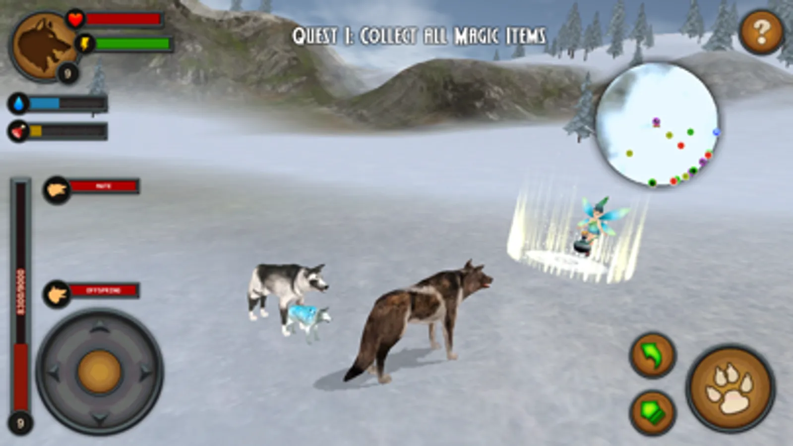 The story begins with a young wolf. Play with some family members, find some food, drink some water, mark some territory, and avoid the enemies. This is the wild land of magic and adventure. Your Wolf will build her skill by completing various quests. Along the way, you will develop your hunting skills. You will need to drink water and stay hydrated. Be sure to hunt and eat when your hunger level gets low.