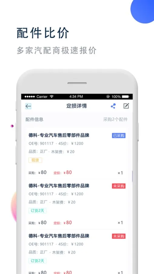 根据车辆的VIN码查找,车辆对应配件。也可以根据VIN码和配件OE号查找车辆和配件匹配情况。创建询价单,记录查询状况。