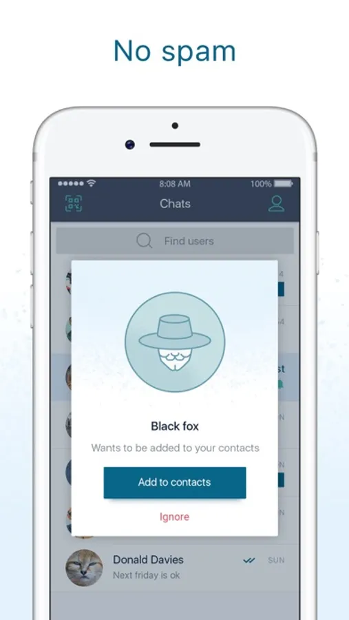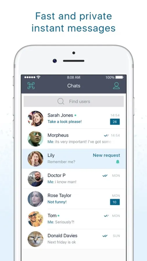 Just show your profile QR-code to your friends and start conversation in seconds. You are still able to choose a username, so other people could find you.