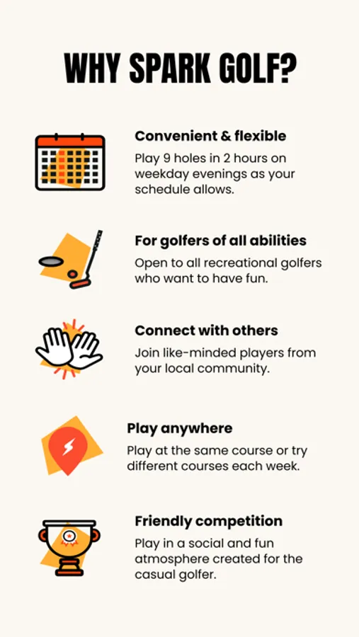 Spark is now a nationwide network of 9-hole, recreational golf leagues where people play fun golf, connect with others and experience friendly competition. We bring people together to play golf. Our intention is to make Spark Golf more fun, social and organized than your everyday round of golf.