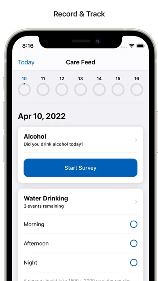DrinkCare let you record and track your daily water consumption, deep breathing frequency and meditation time.