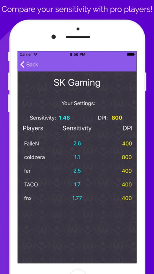 After completing the sensitivity test, compare your settings against pro players from over 10 different world class teams!