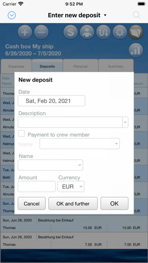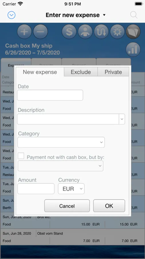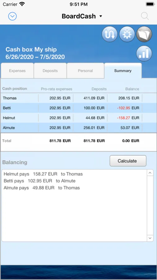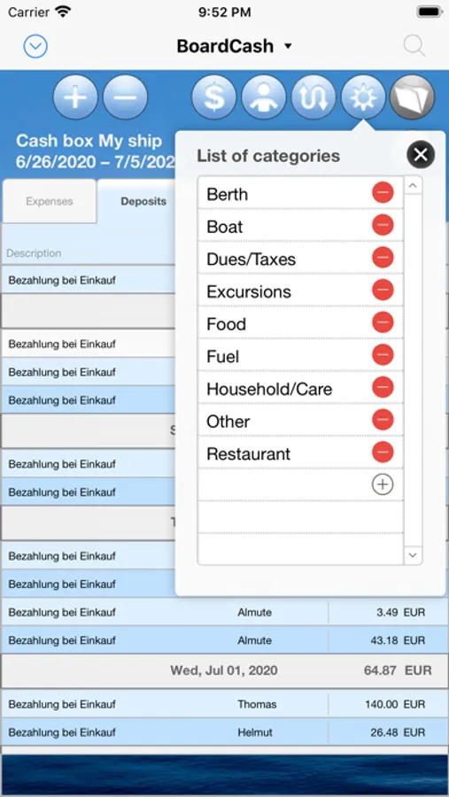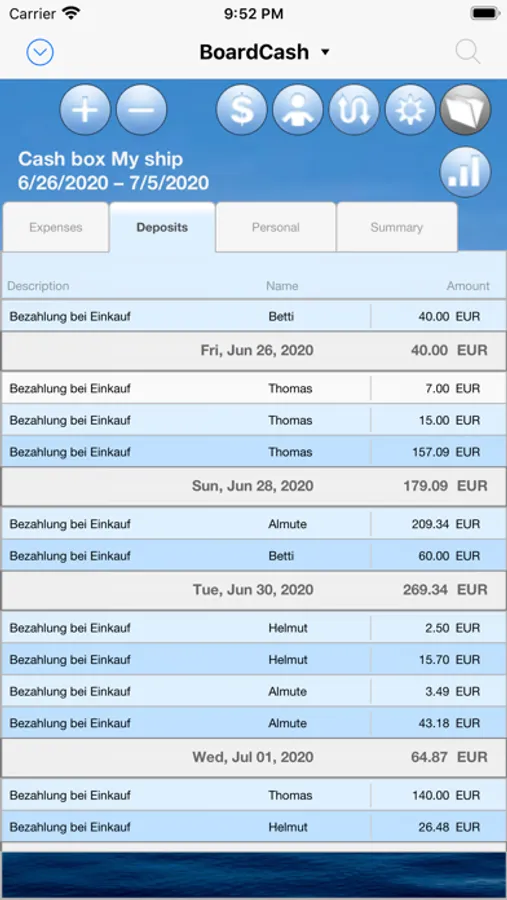 In "BoardCash" you can enter all deposits of the crew members and all expenses from the cash box. Also special cases, such as when a crew member makes a purchase, without using the cash box, are handled automatically. It is also easy to capture purchases, which also include private purchases for individual crew members in the grand total. Of course, "BoardCash" can also take different proportions of the crew members on the board cash into account (eg. with couples and individuals in the crew).