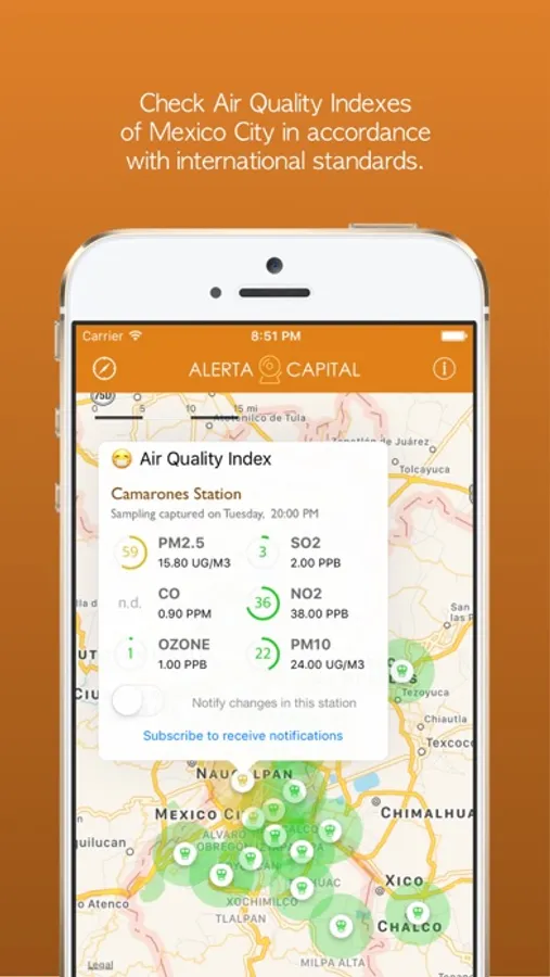 • This app provides air quality indexes in Mexico City according to international scales to measure the impact of pollution on people.