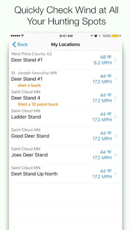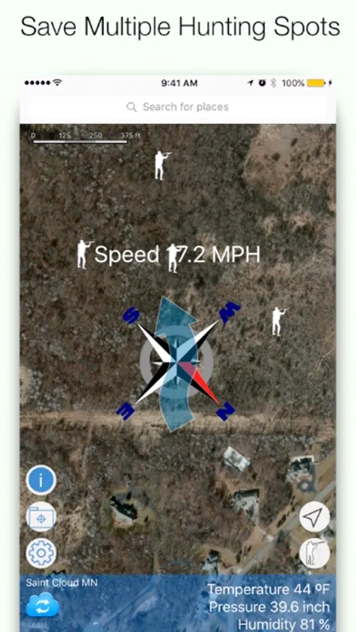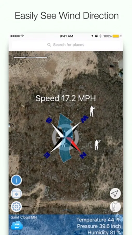 - Use pin markers to save up to 10 hunting locations for quick reference of wind direction at your favorite hunting spots