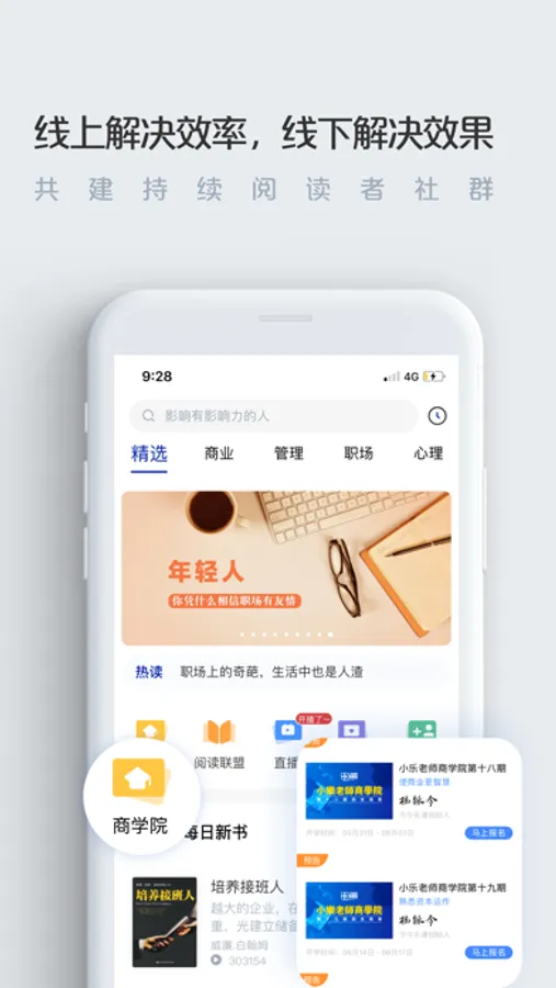 书香大学、私董会、小乐老师商学院、线上持续复盘力训练营、大咖读书会,多角度引导书友持续阅读,128天完成一次自我迭代。