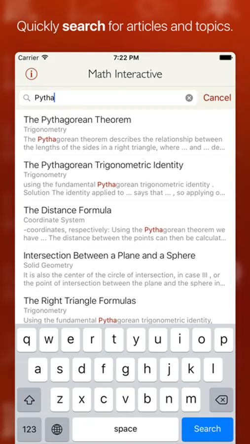 With 23 subjects containing more than 200 articles with detailed descriptions, solved solutions and thorough proofs, this app is perfect for every high school student or any person eager to learn mathematics. Improve your intuition by exploring the interactive illustrations and learn how to solve both simple and difficult math problems through elegant solutions. Buy Premium to access all content and features.