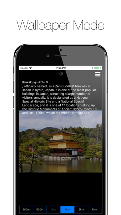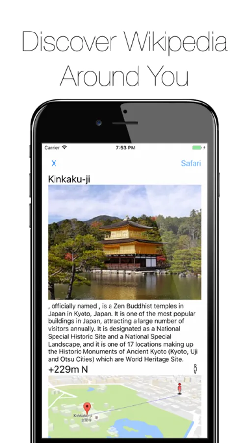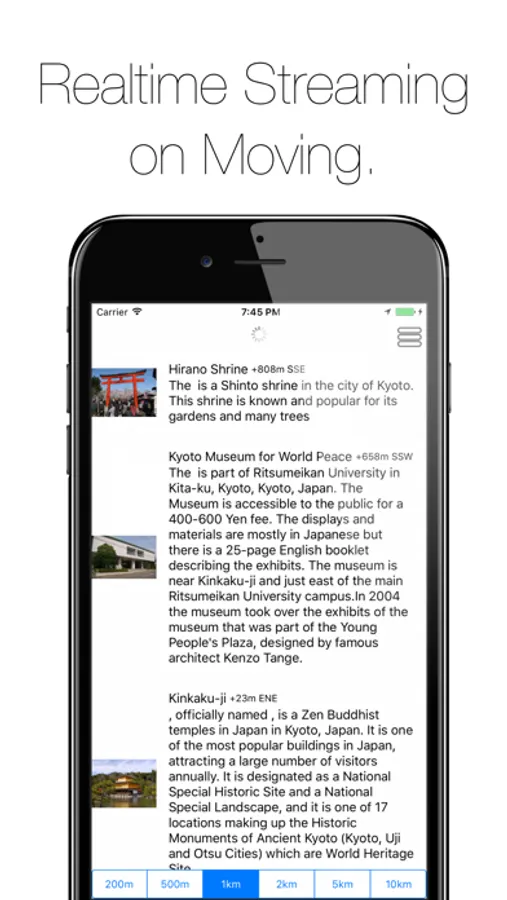 Streaming Wikipeda place articles around current location by GPS/Location information realtime .Discover new place on sightseeing or driving.