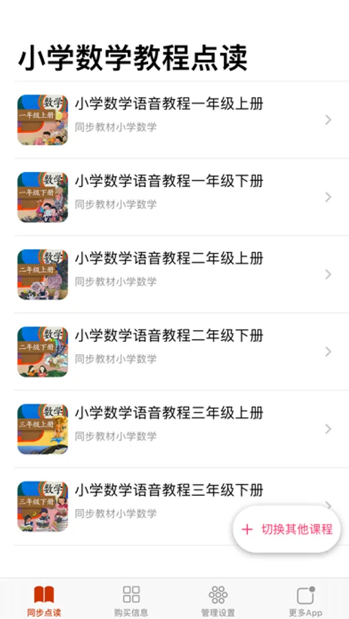 《小学数学一年级上册下册》、《小学数学二年级上册下册》、《小学数学三年级上册下册》点读教材。