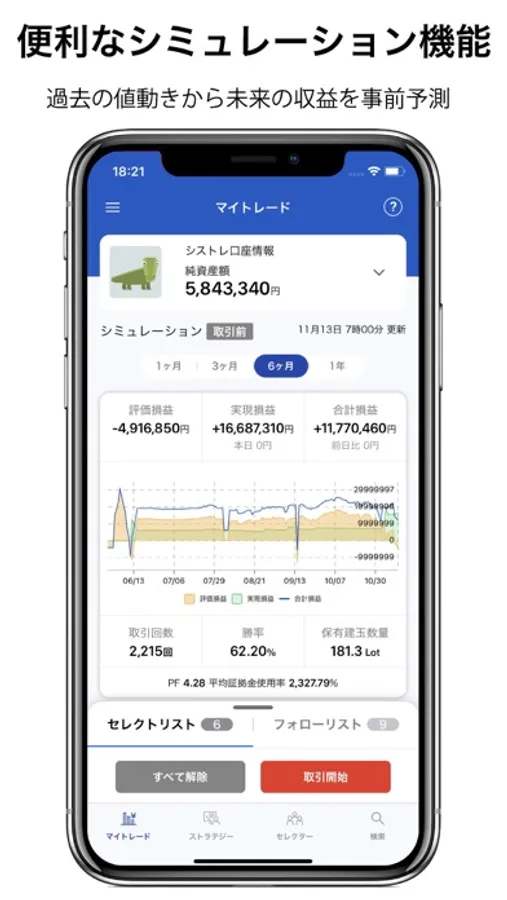「このストラテジーを選択したら、どのくらいの利益が出るのか?」という疑問に答える機能です。過去の取引をもとに将来の予想収益を計算。システムトレードを稼働させる前に、将来の収益の参考値をチェックすることができます。