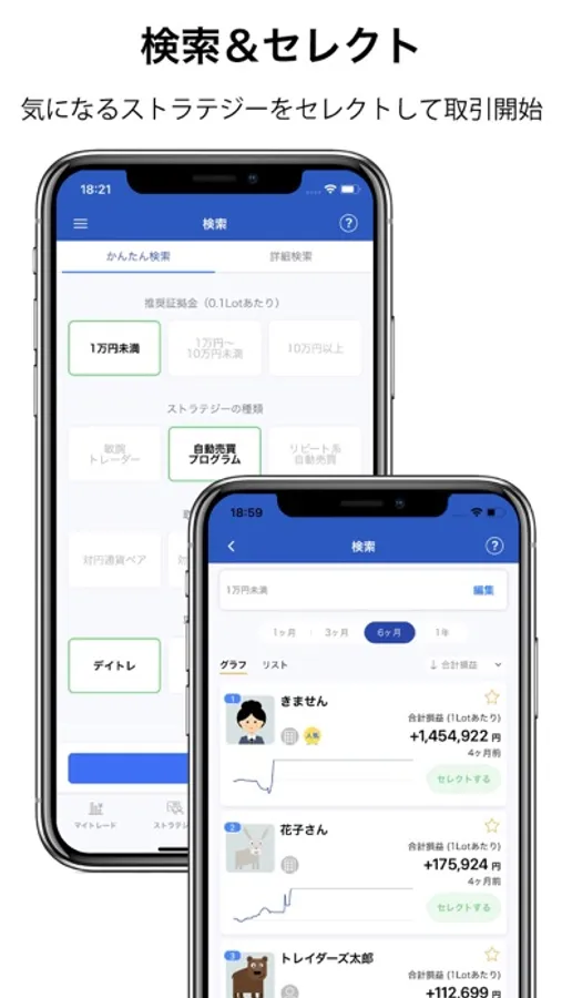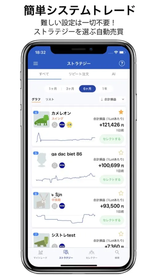 FXのシステムトレード(自動売買)を行う商品です。検索画面からお気に入りのストラテジー(自動戦略)を選ぶと、選択したストラテジーの取引に準じて自動で取引が行われます。