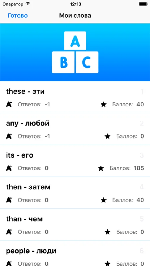 - Просматривай статистику ответов по словам и играм. Количество набранных баллов и правильных ответов всегда в твоем iPhone.